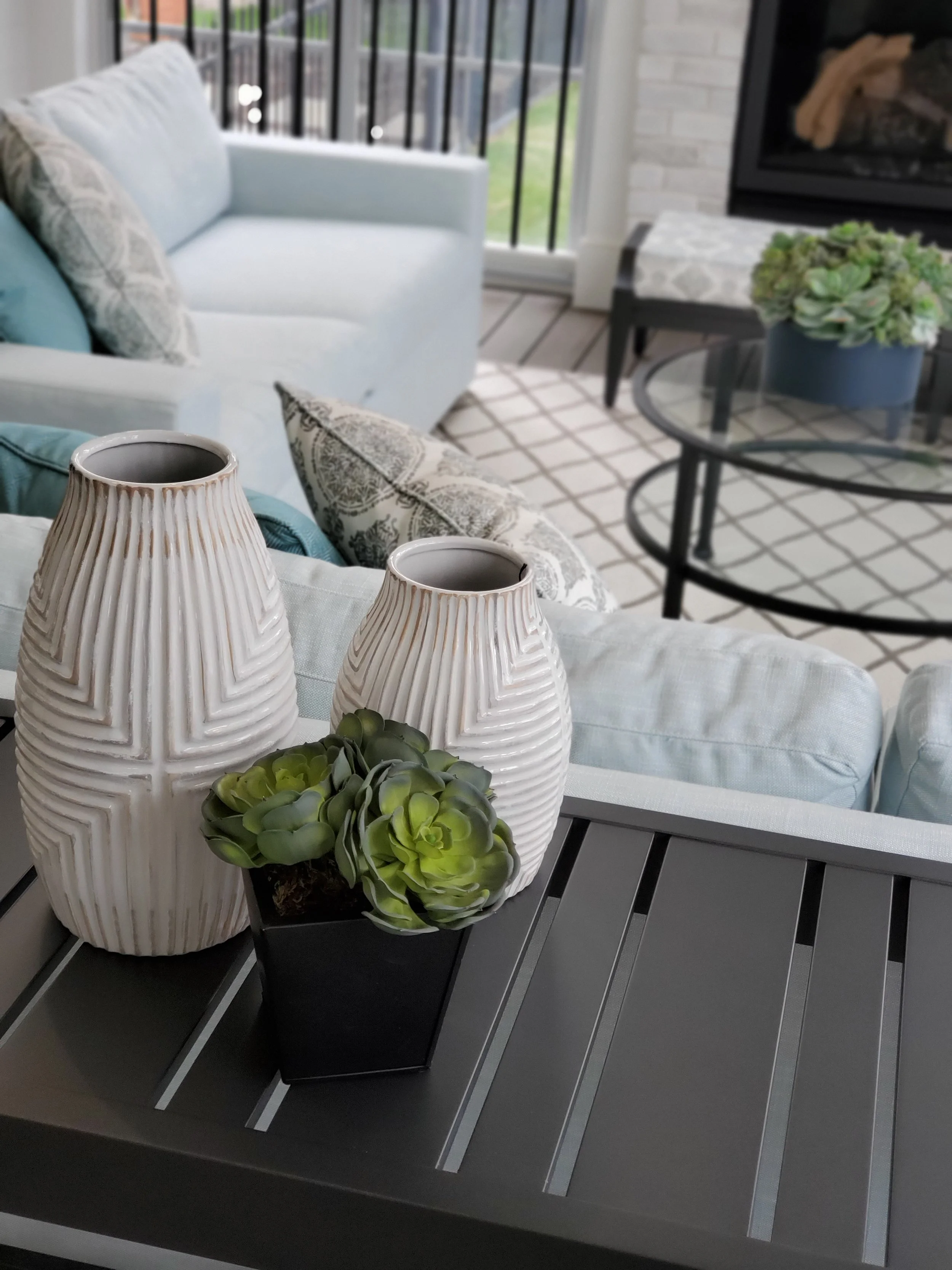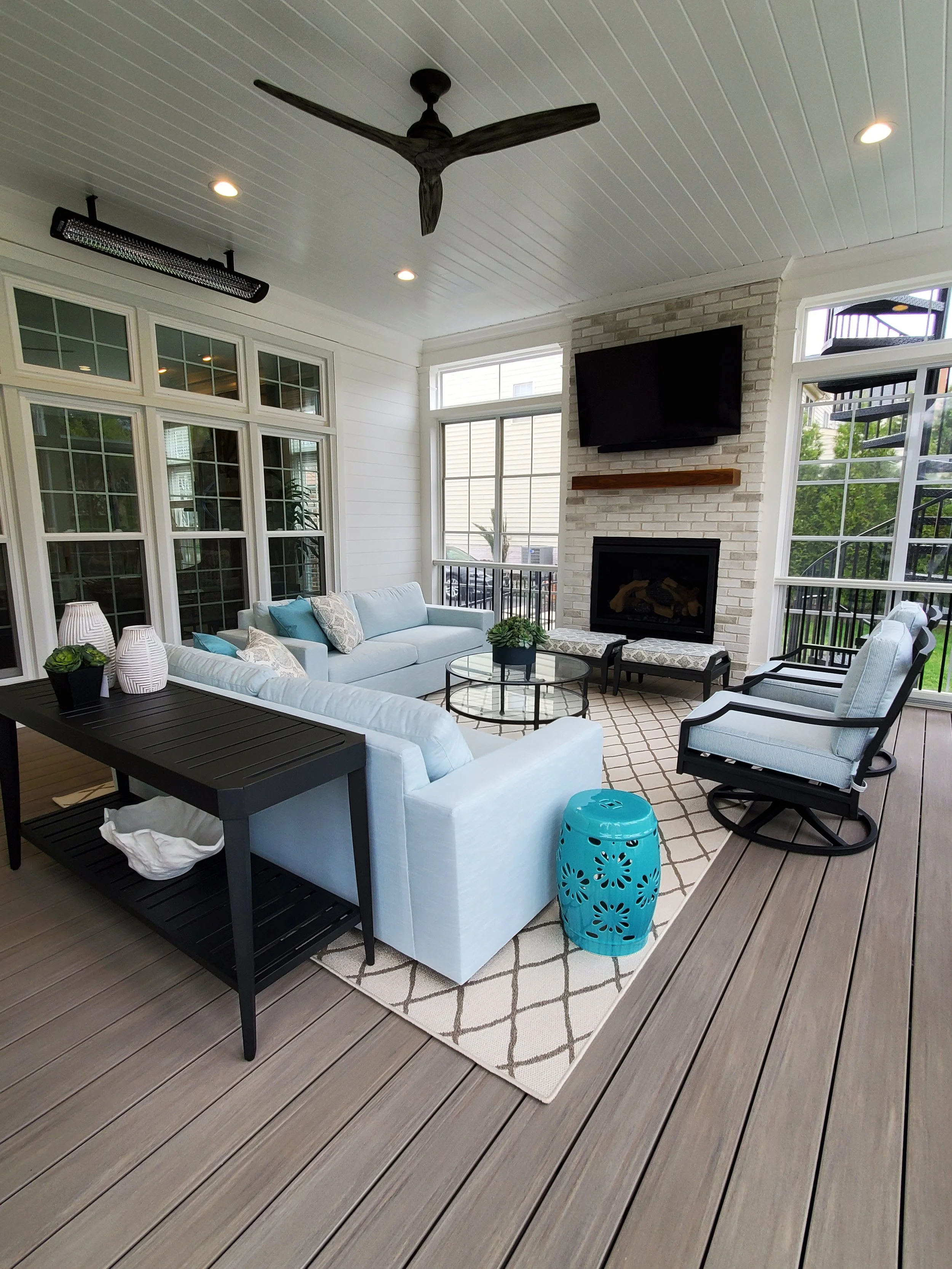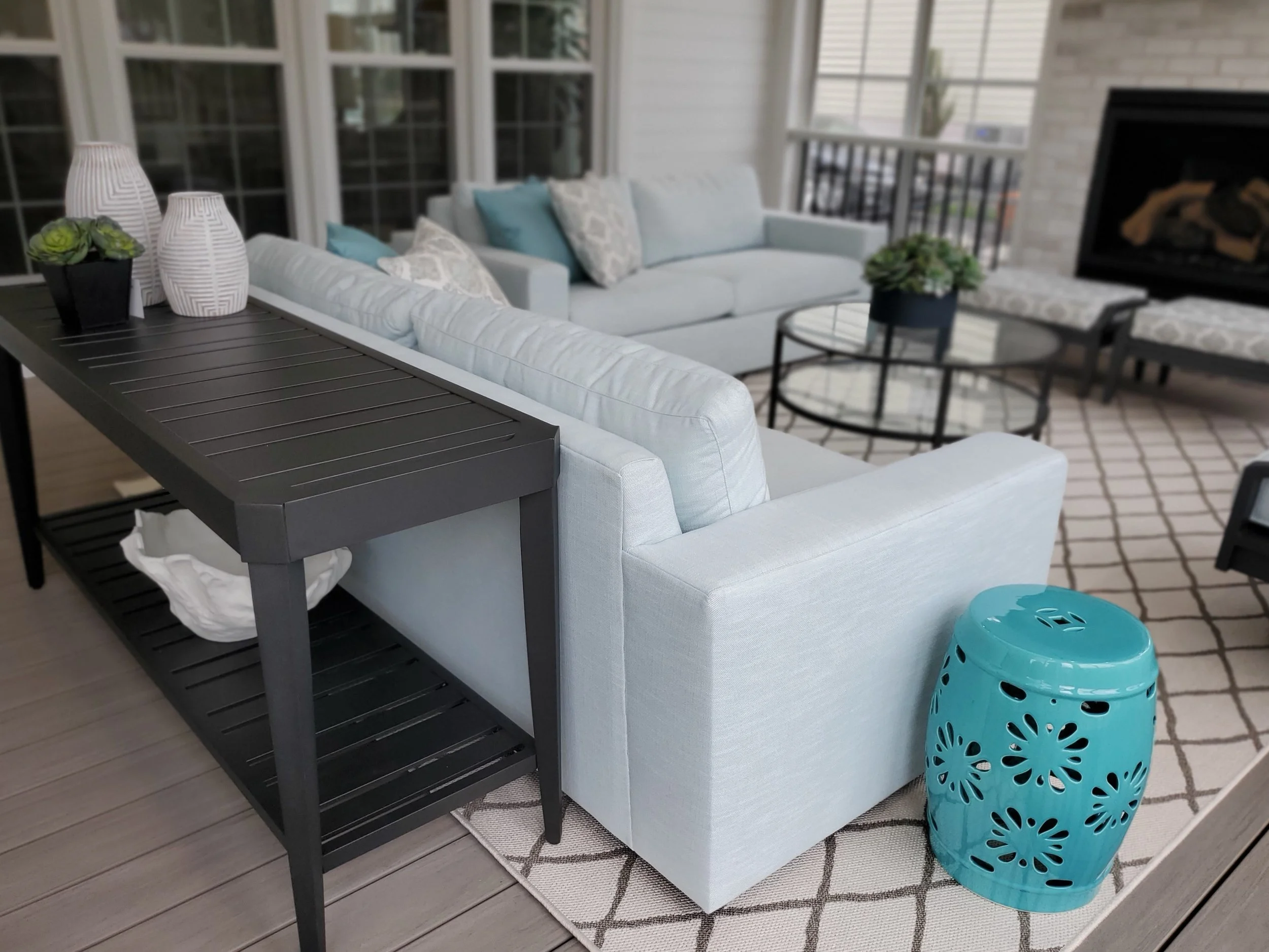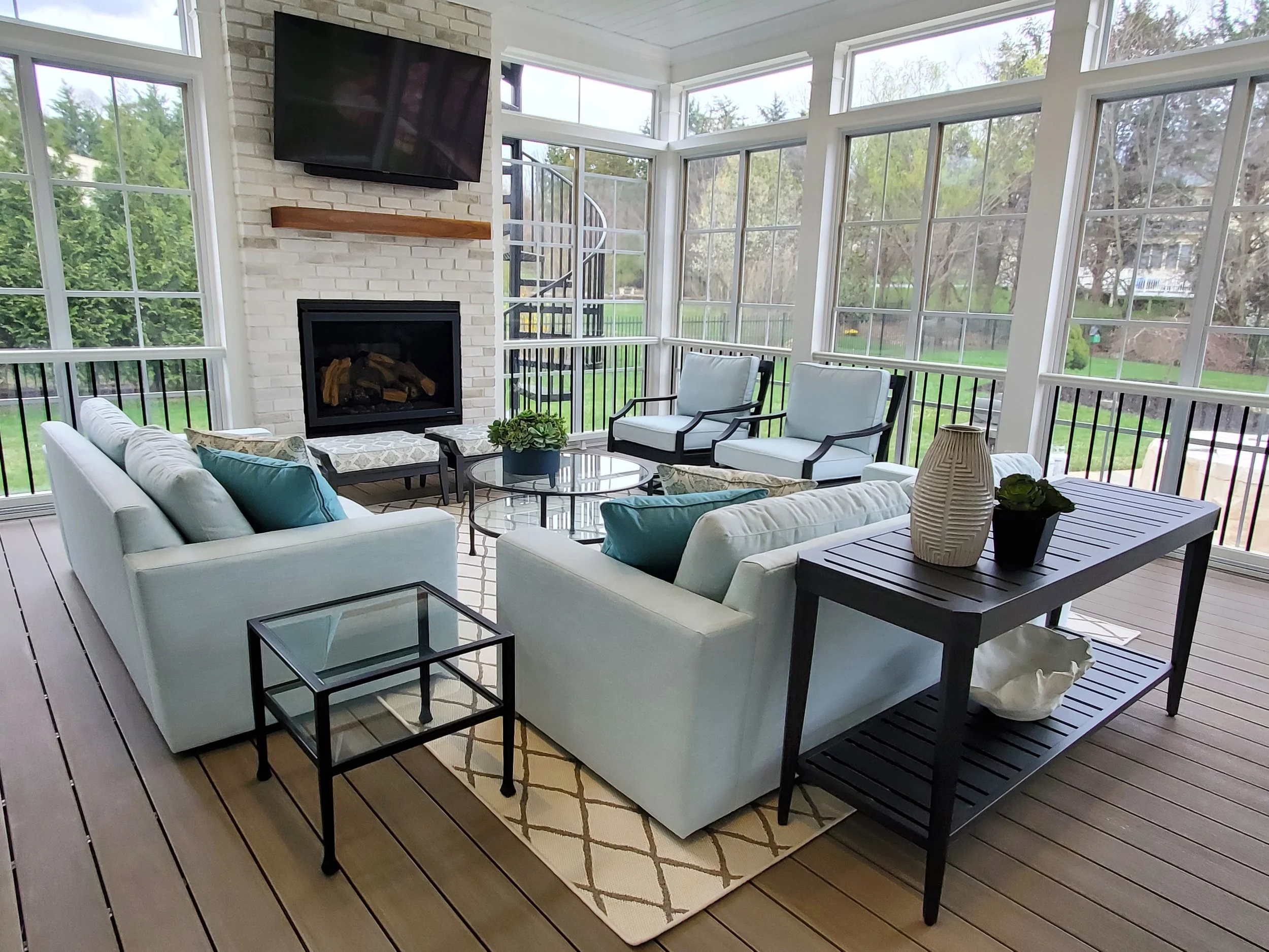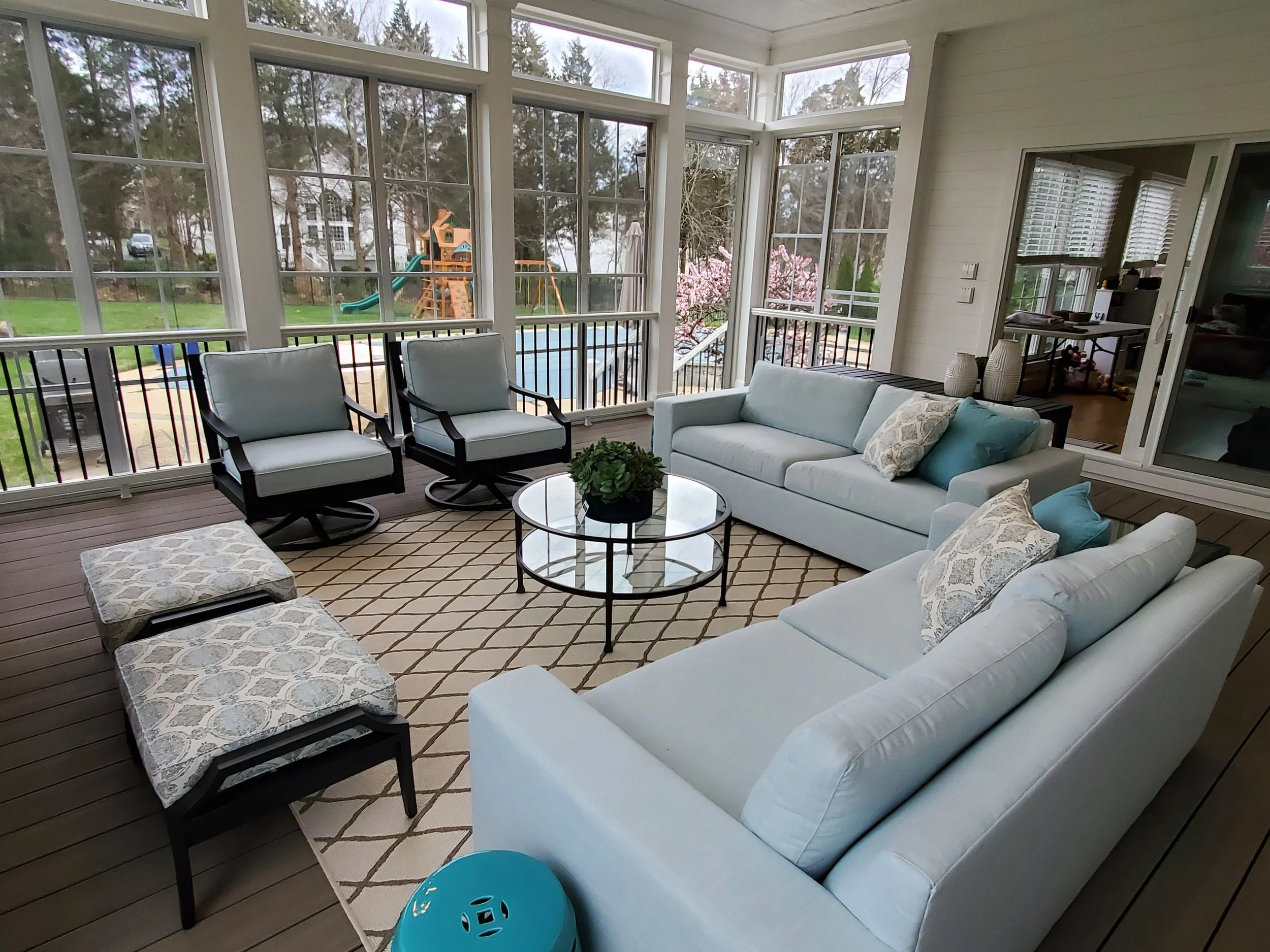 This 3-Season Room addition to my client's house is the perfect extension of their interior. A fresh and bright palette brings the outside in, giving this family of 4 a space they can relax in after a day at the pool, or gather with friends for a cocktail in front of the fireplace.