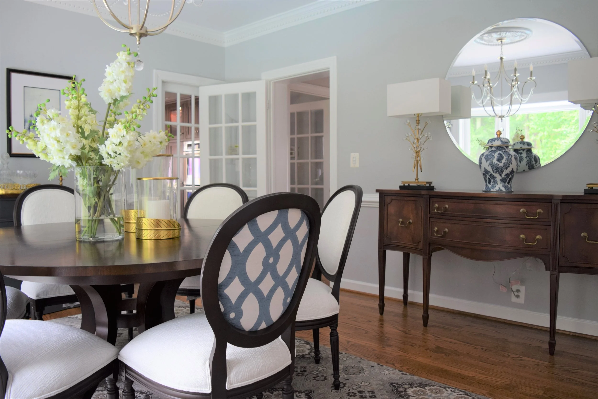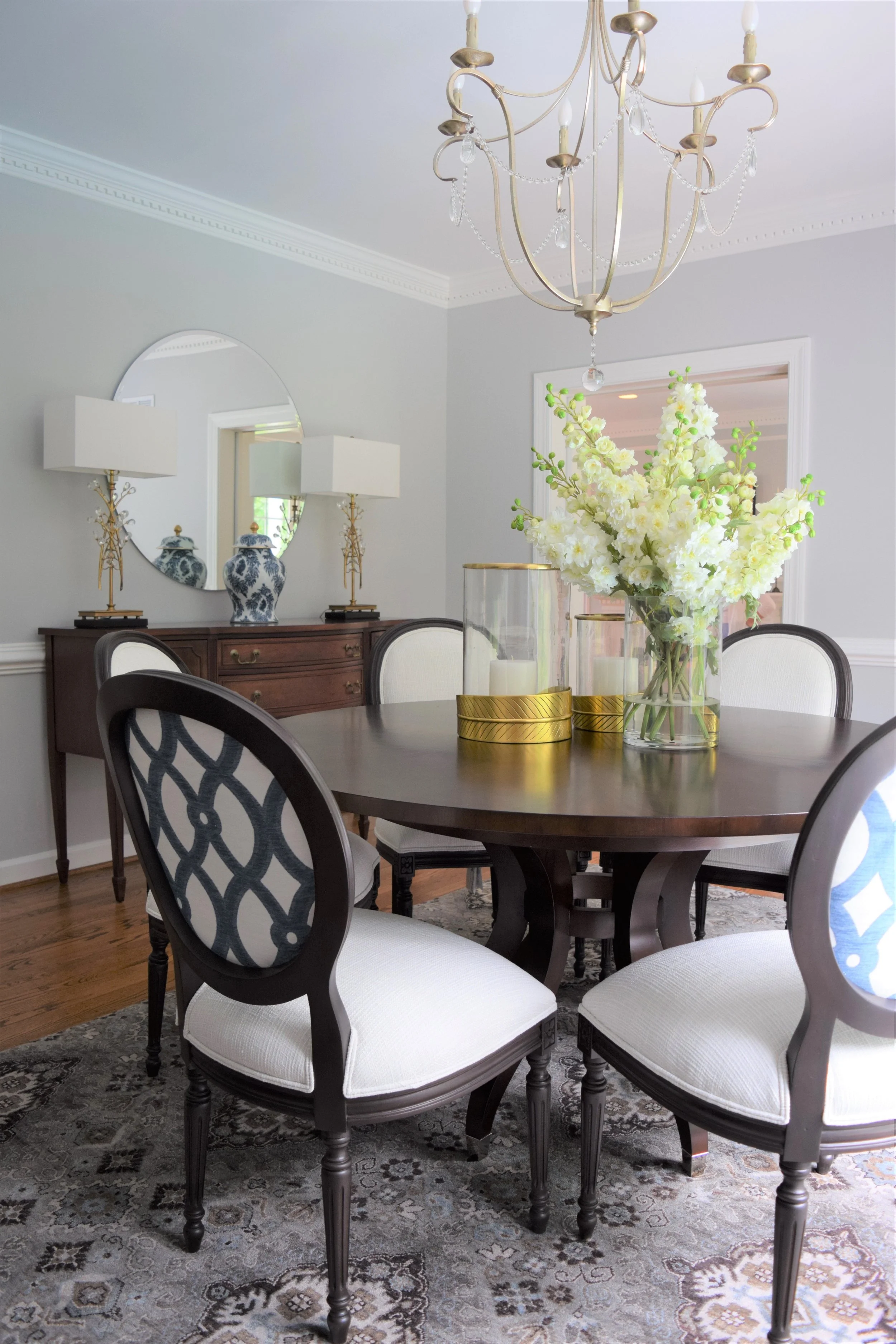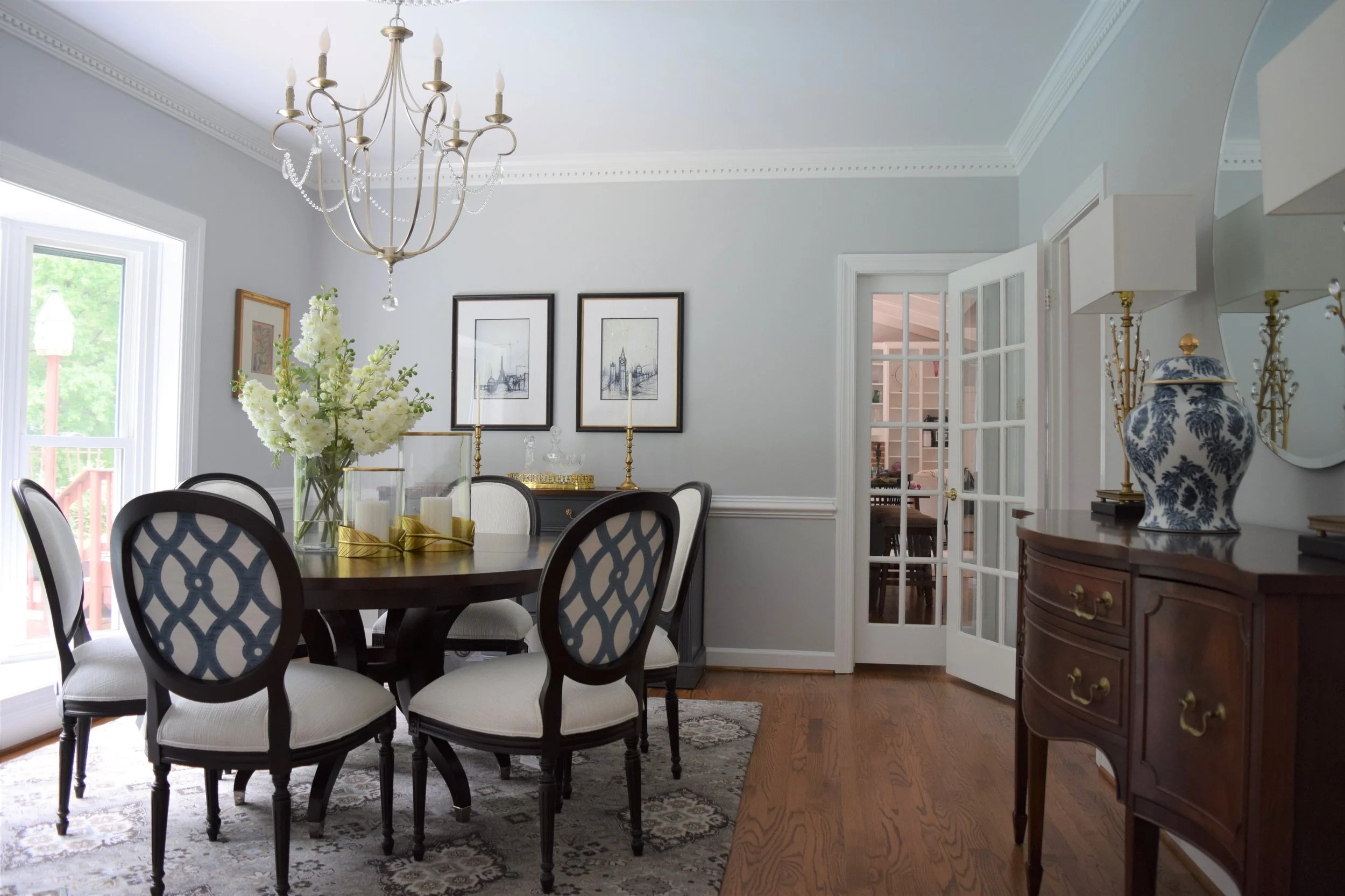 Reflecting my client's love of European travel and collected antiques, I infused elements reflecting these things in the artwork, buffet styling, and hand-loomed oriental rug. Crisp fabrics against dark wood add high contrast which is updated but timeless, and the dual fabric application on the Louis chairs is an unexpected modern detail. Adding in crystal details in the lighting, along with the blue and white ginger jar keeps the room elegant and classic.