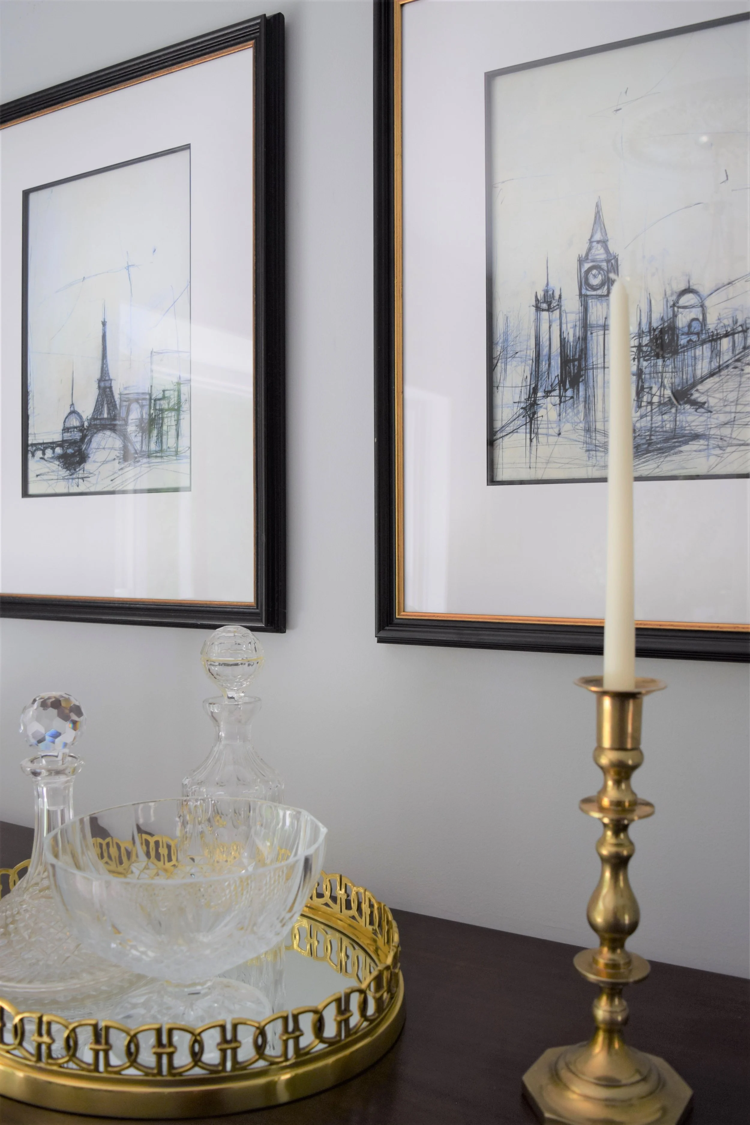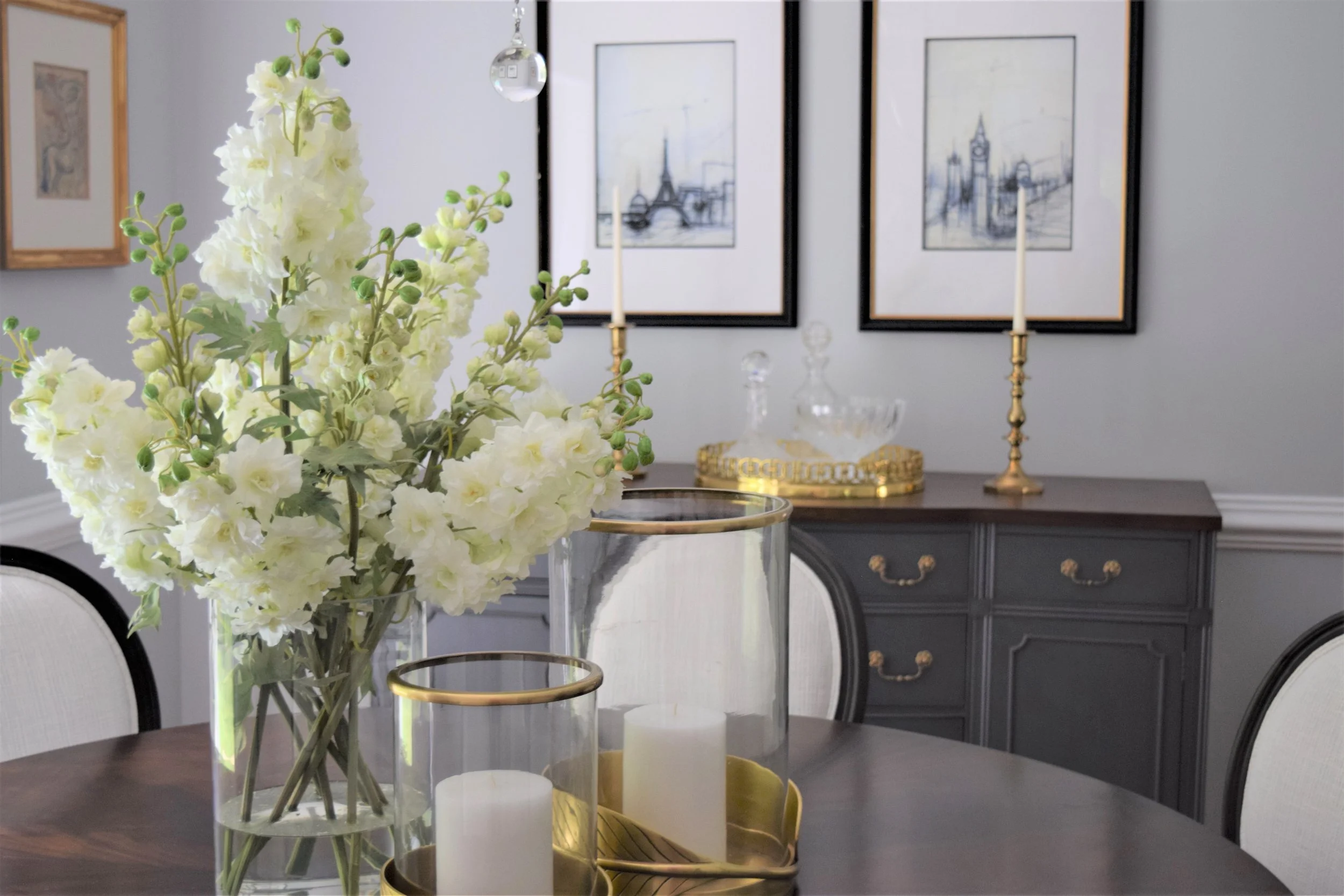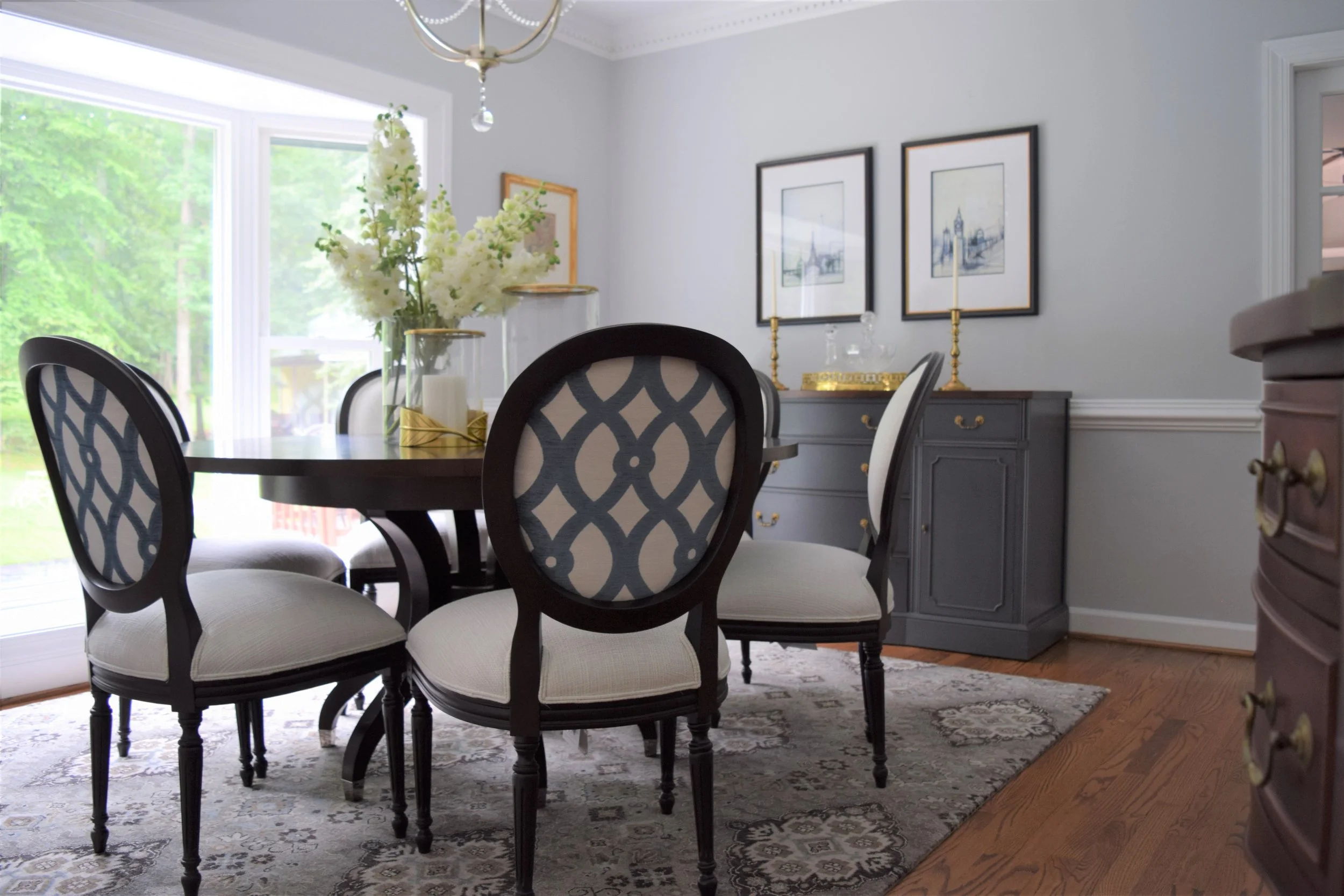 Reflecting my client's love of European travel and collected antiques, I infused elements reflecting these things in the artwork, buffet styling, and hand-loomed oriental rug. Crisp fabrics against dark wood add high contrast which is updated but timeless, and the dual fabric application on the Louis chairs is an unexpected modern detail. Adding in crystal details in the lighting, along with the blue and white ginger jar keeps the room elegant and classic.
